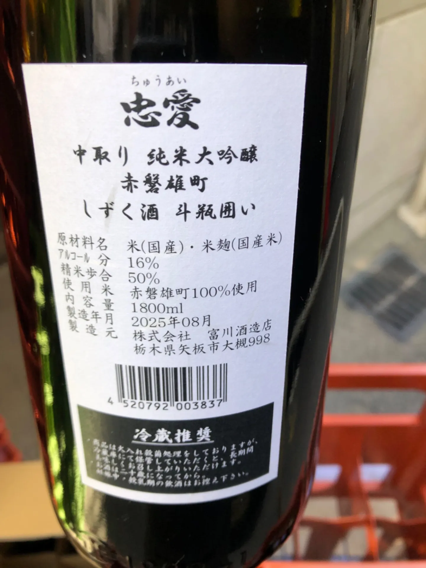 栃木県 富川酒造 忠愛 中取り純米大吟醸 赤磐雄町 しずく酒 斗瓶囲い 1800ml