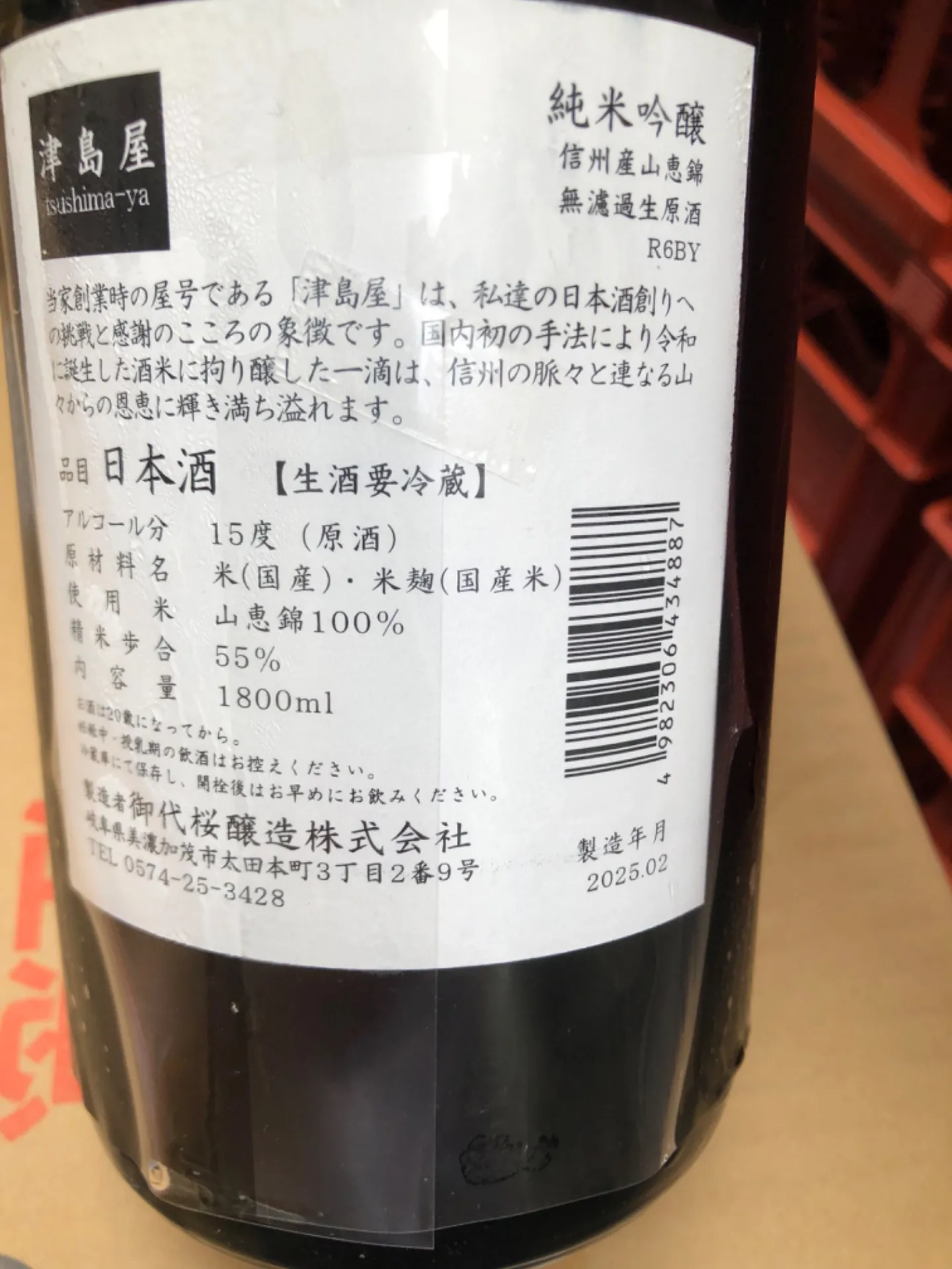 岐阜県 御代桜酒造 津島屋 純米吟醸 生 信州山恵錦 1800ml