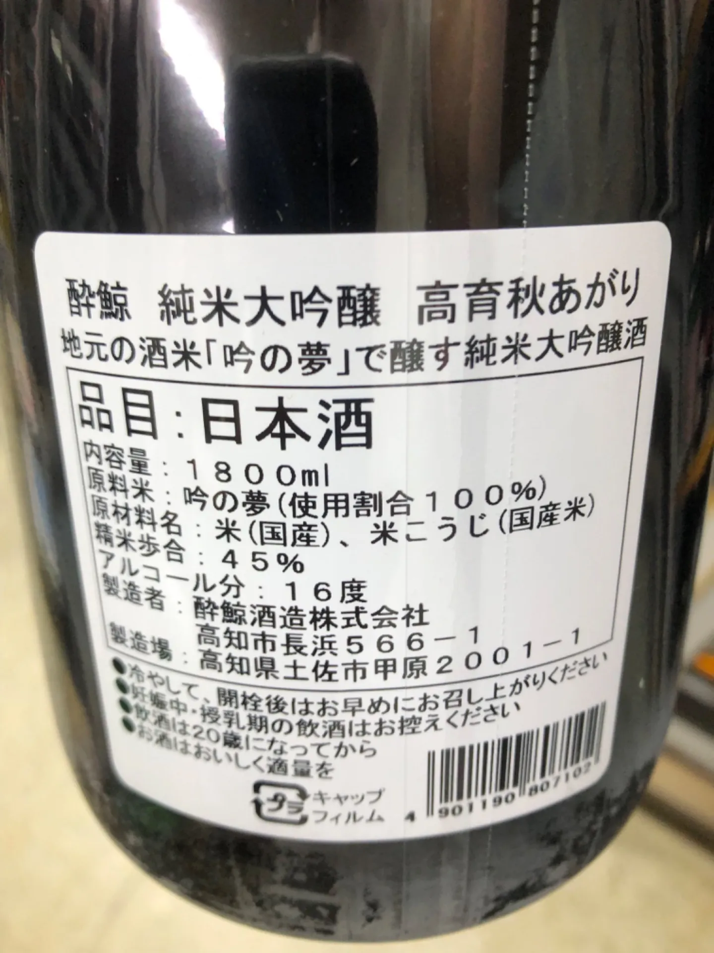高知県 酔鯨酒造 酔鯨 高育 純米大吟醸 秋あがり 1800ml