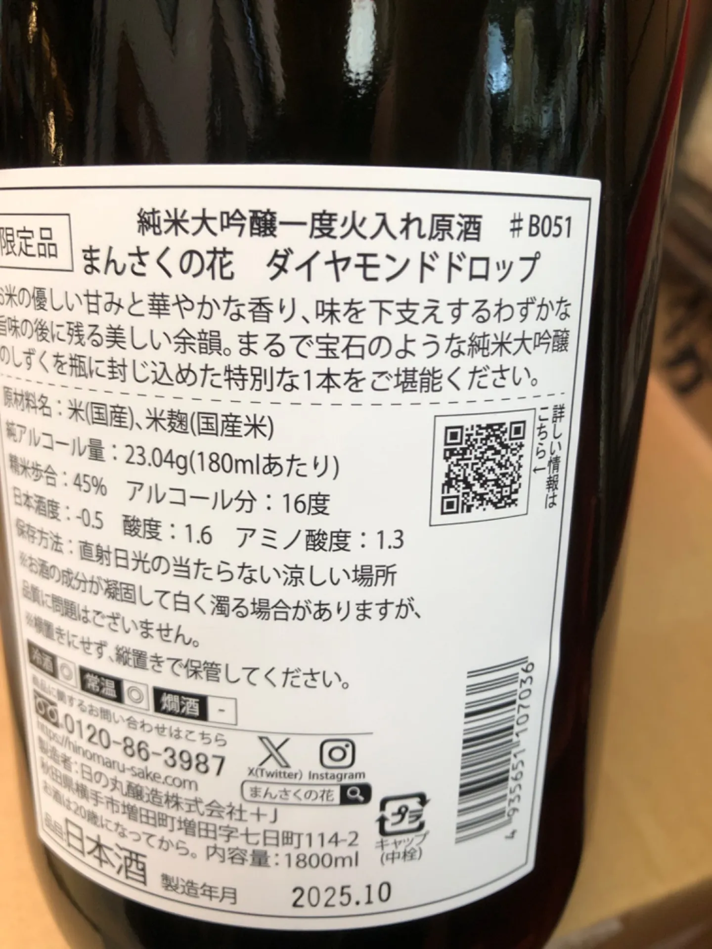 秋田県 日の丸醸造 まんさくの花 ダイヤモンド ドロップ 純米大吟醸一度火入れ原酒 低温瓶囲原酒 精米歩合45% 1800ml