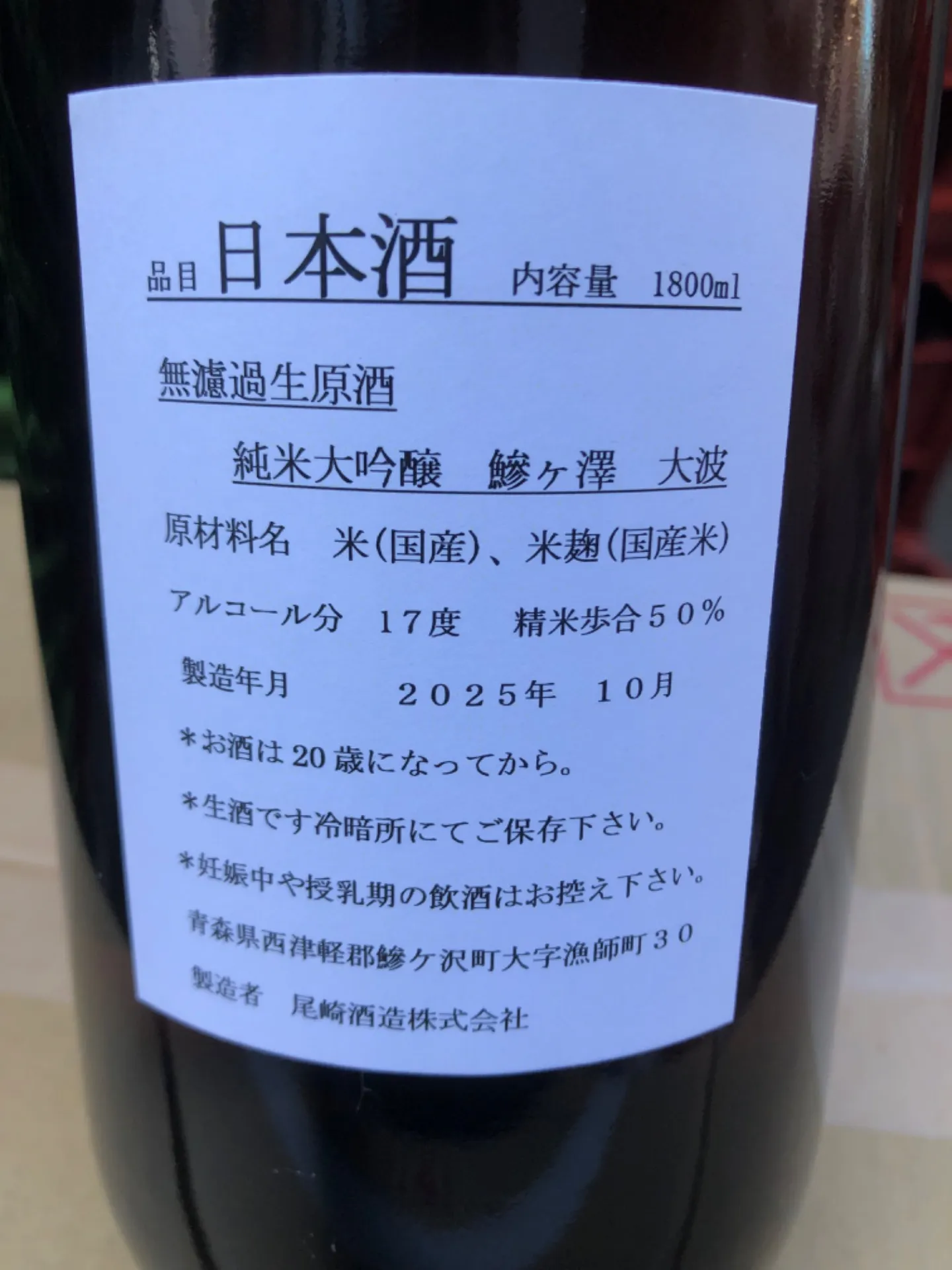 青森県 尾崎酒造 鰺ヶ澤 大波 純米大吟醸 氷温熟成 無濾過生原酒 1800ml