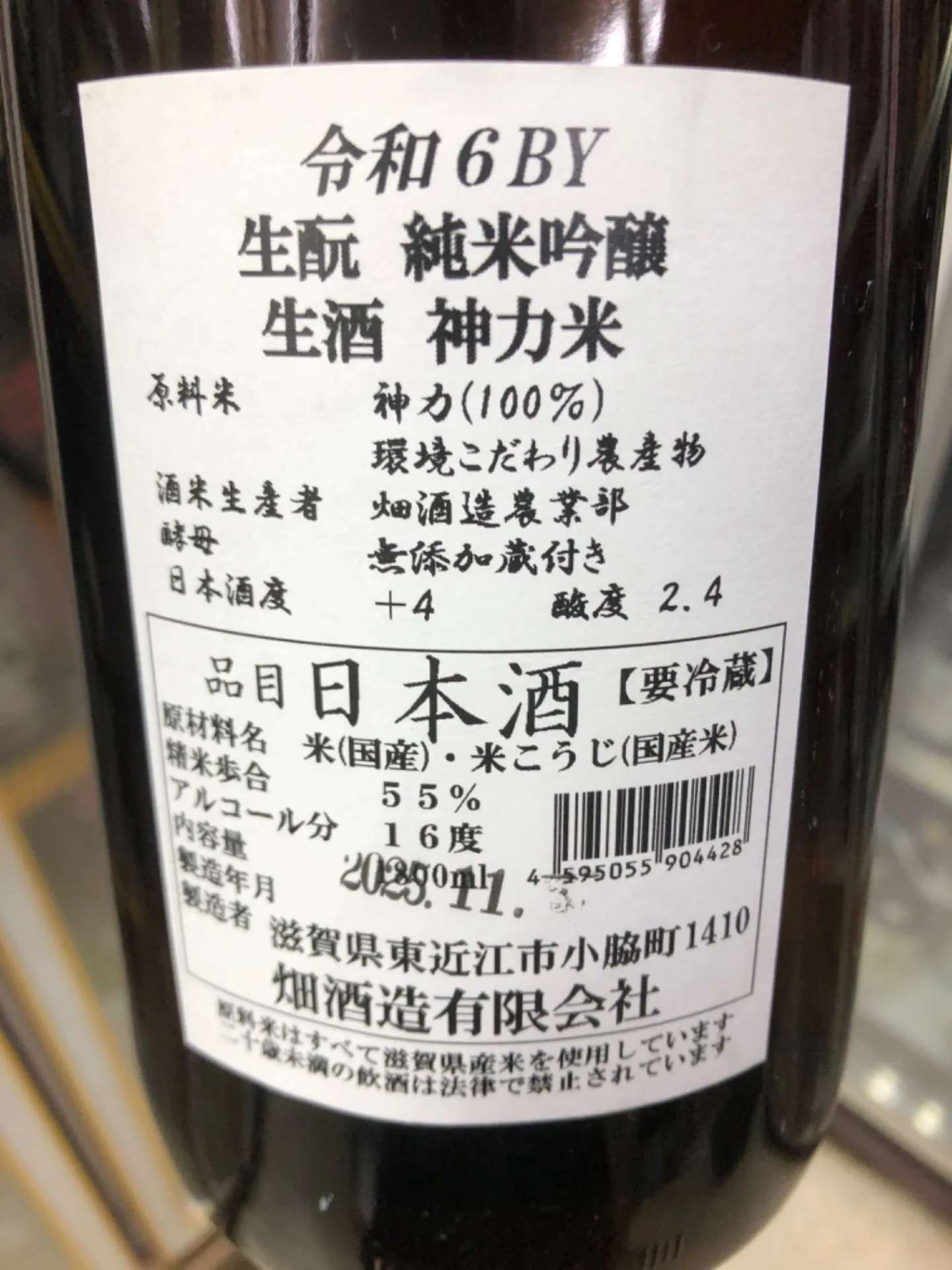 滋賀県 畑酒造 㐂量能キリョウヨシ 生酛 純米吟醸 生酒 神力米 辛口 1800ml