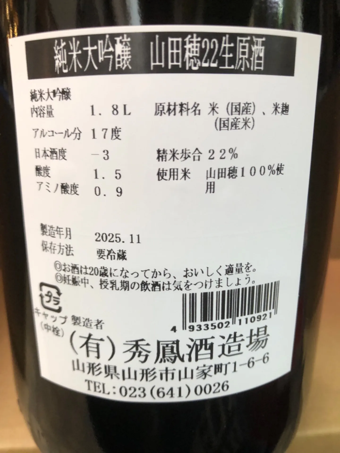 山形県 秀鳳酒造 秀鳳 純米大吟醸 山田穂 磨き2割2分 生酒 1800ml