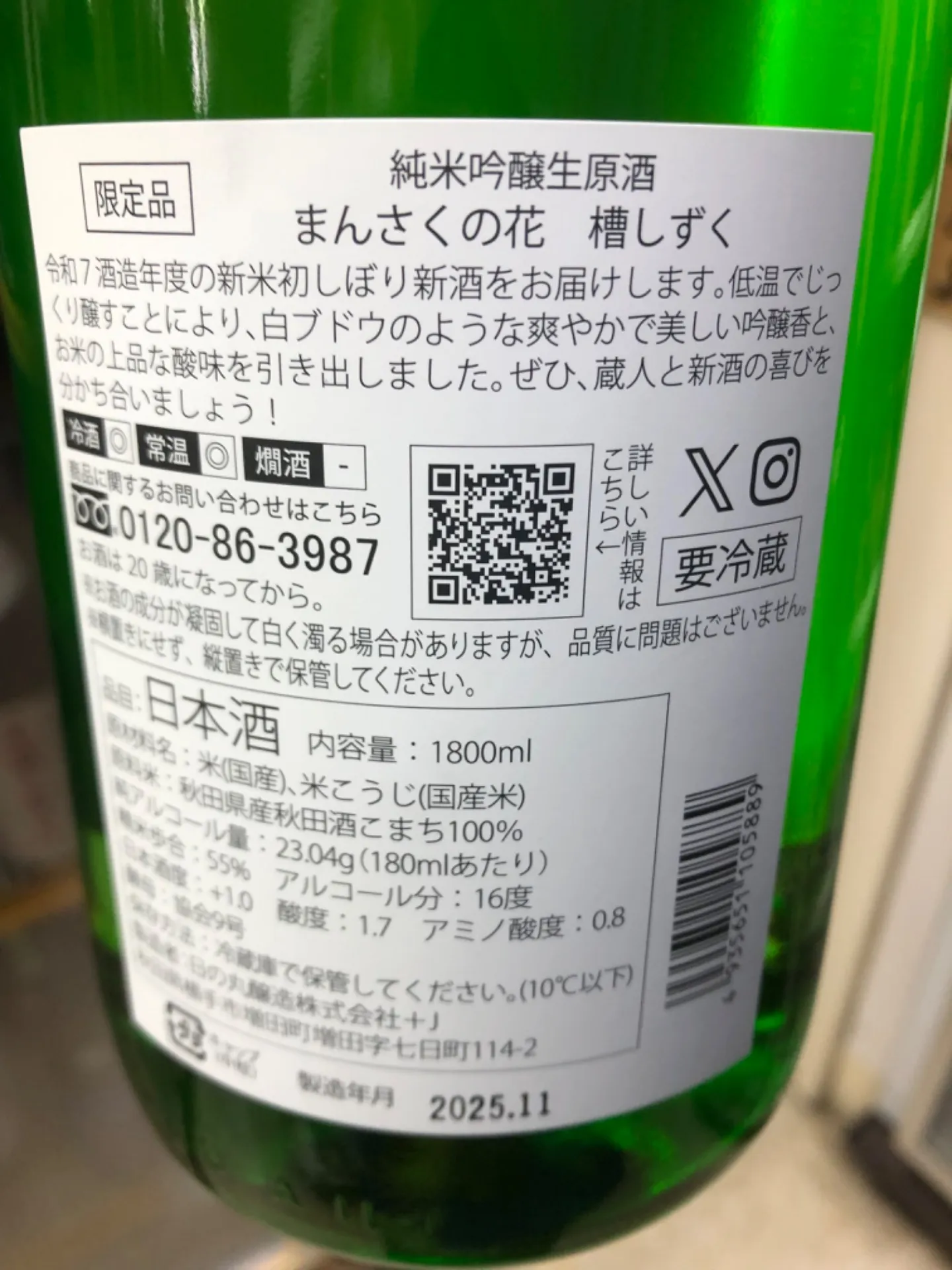 秋田県 日の丸醸造 まんさくの花 槽しずく 純米吟醸生原酒 1800ml