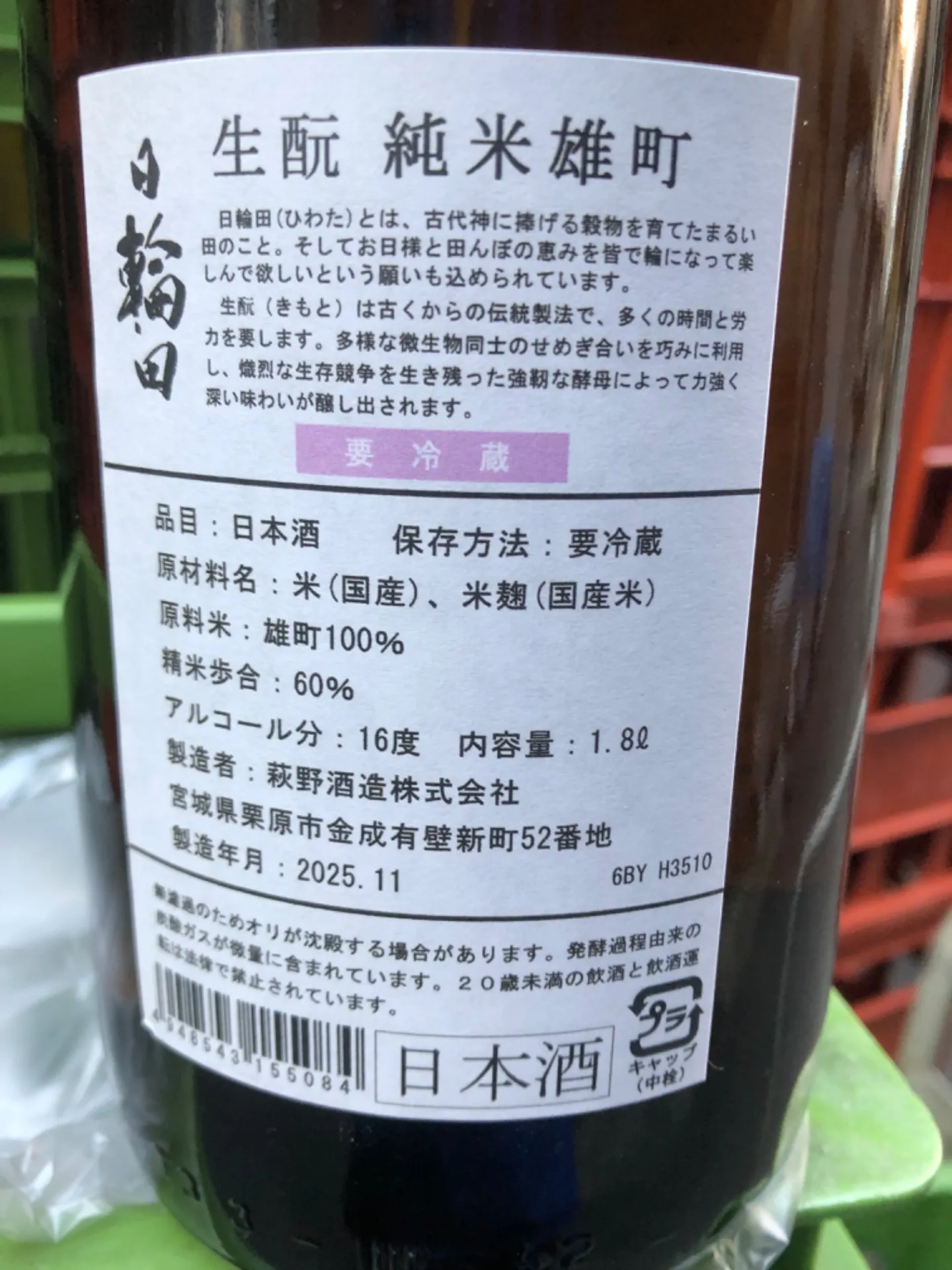 宮城県 萩野酒造 日輪田 生酛純米 雄町 1800ml