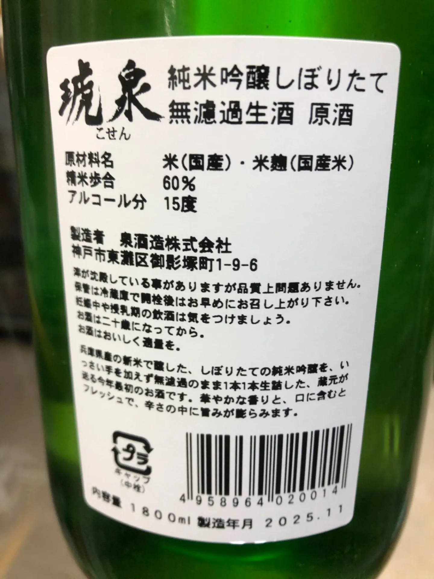 兵庫県 泉酒造 琥泉 純米吟醸 しぼりたて 無濾過生原酒 1800ml