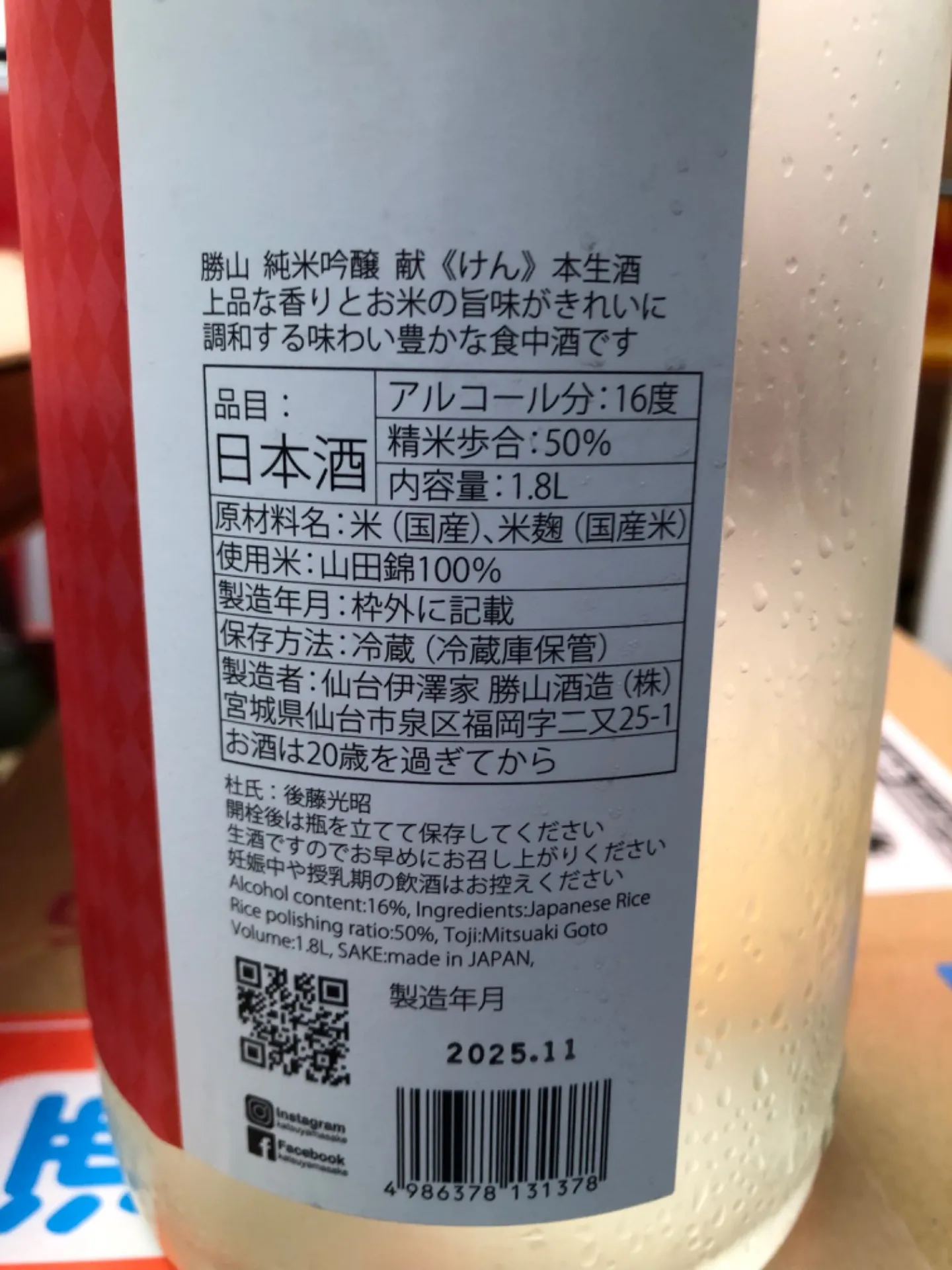 宮城県 仙台伊澤家 勝山酒造 勝山 献ーけんー 純米吟醸 本生酒 山田錦100% 1800ml