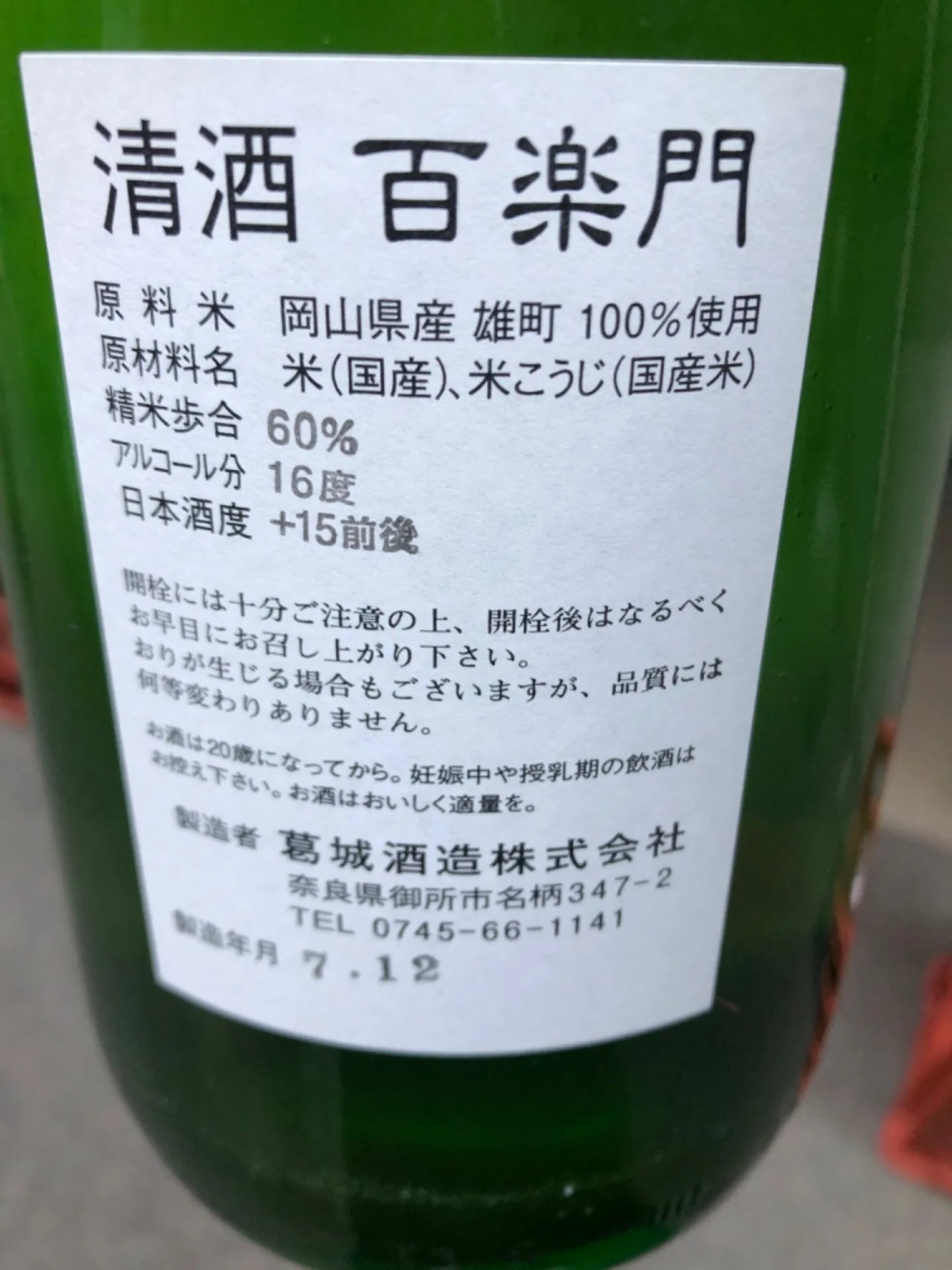 奈良県 葛城酒造 百楽門 裏冴 +15 特別純米 備前雄町100% 1800ml