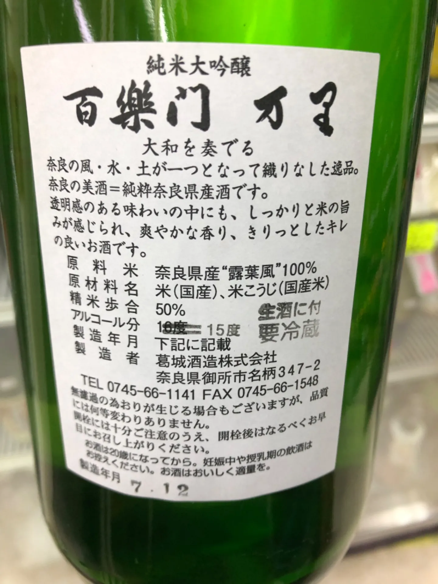 奈良県 葛城酒造 百楽門 万里 純米大吟醸 露葉風100% 1800ml