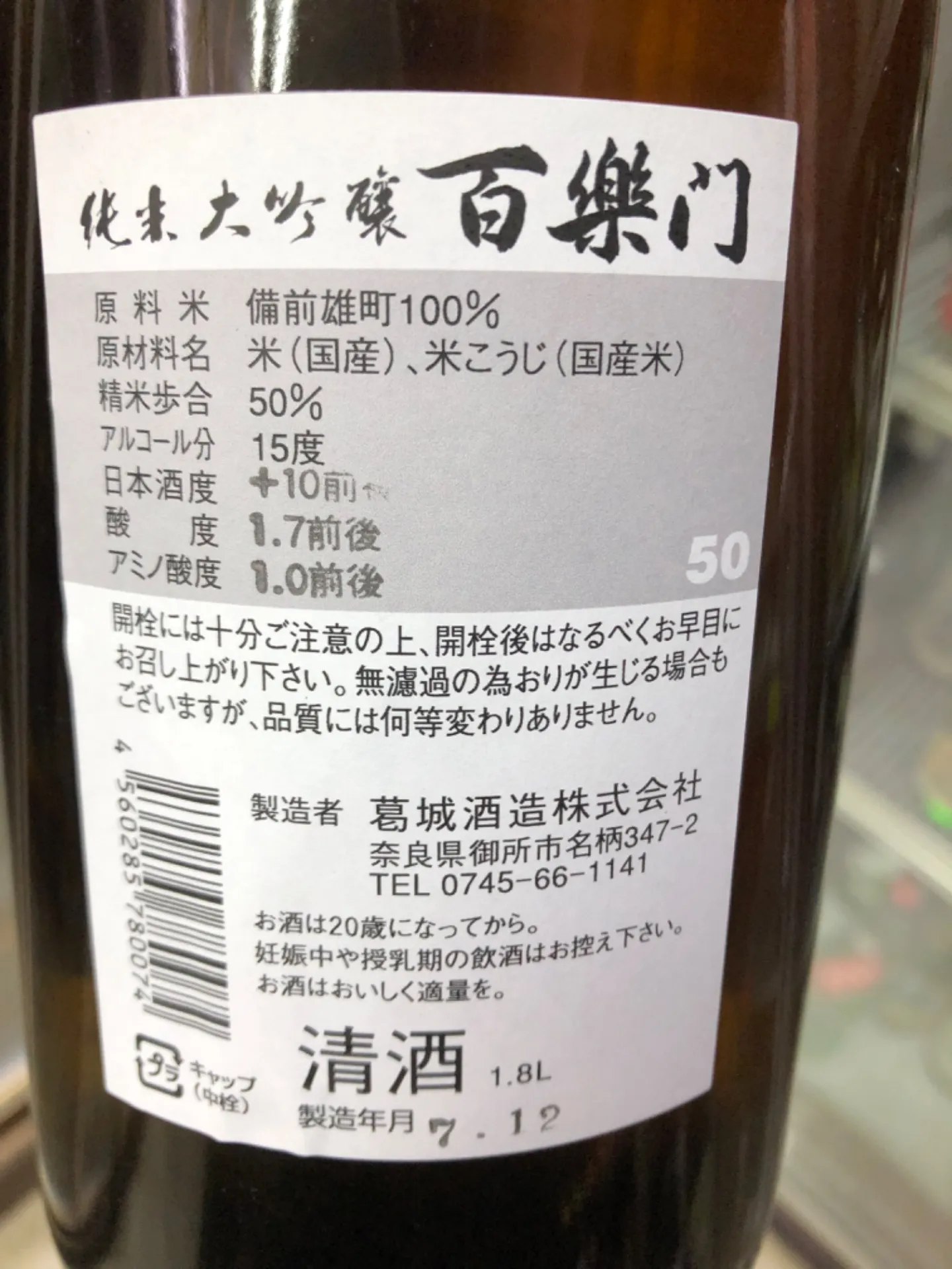 奈良県 葛城酒造 百楽門 純米大吟醸50 備前雄町100% 1800ml