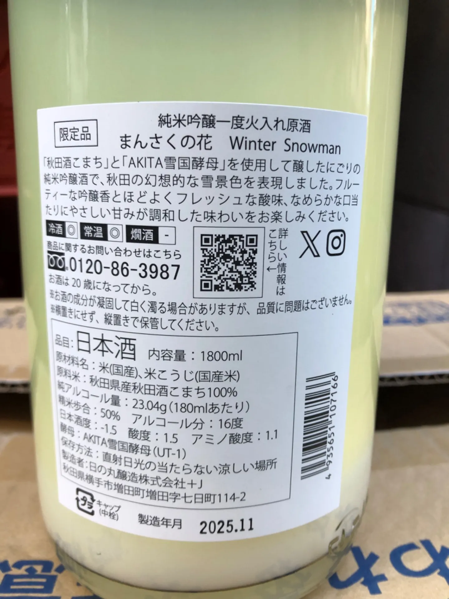 秋田県 日の丸醸造 まんさくの花 Winter snow man 純米吟醸一度火入れ原酒 限定品 1800ml