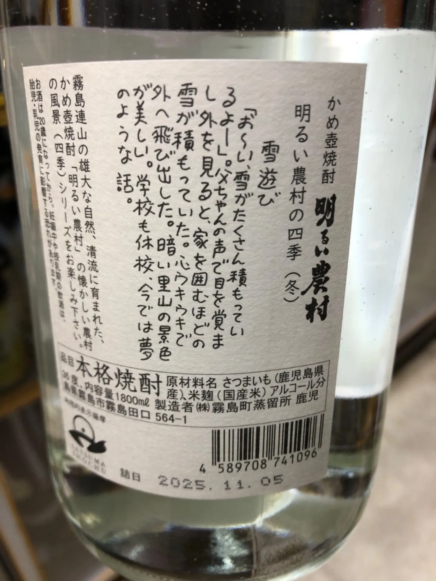鹿児島 霧島町蒸留所 明るい農村の四季(冬)芋焼酎25度 1800ml