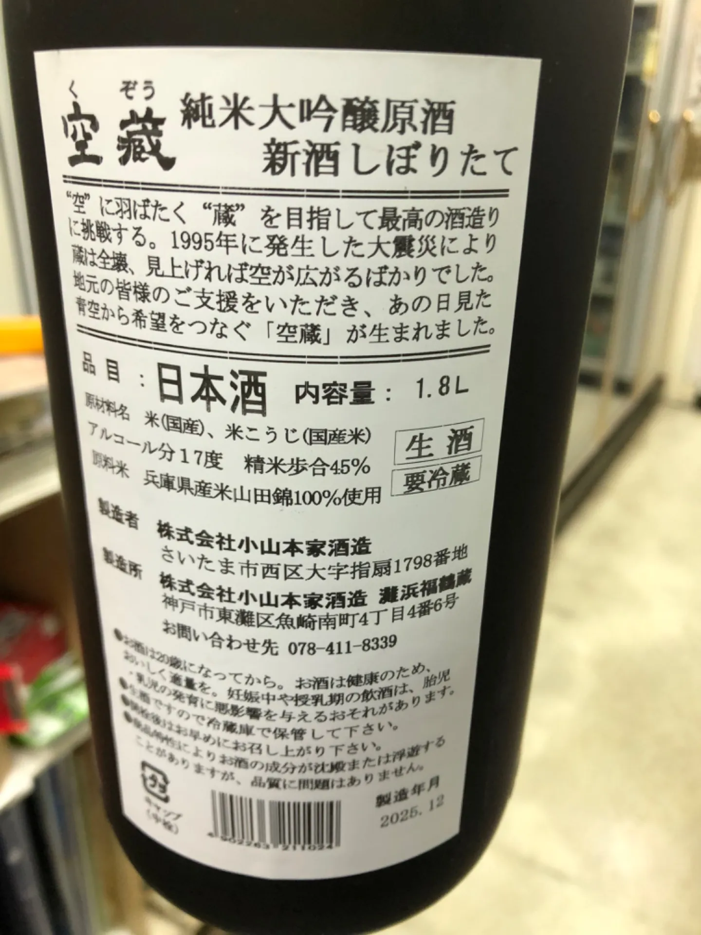 兵庫県 小山本家酒造 灘浜福鶴蔵 空蔵 搾りたて 純米大吟醸生酒 山田錦 100%使用 冬限定品 1800ml