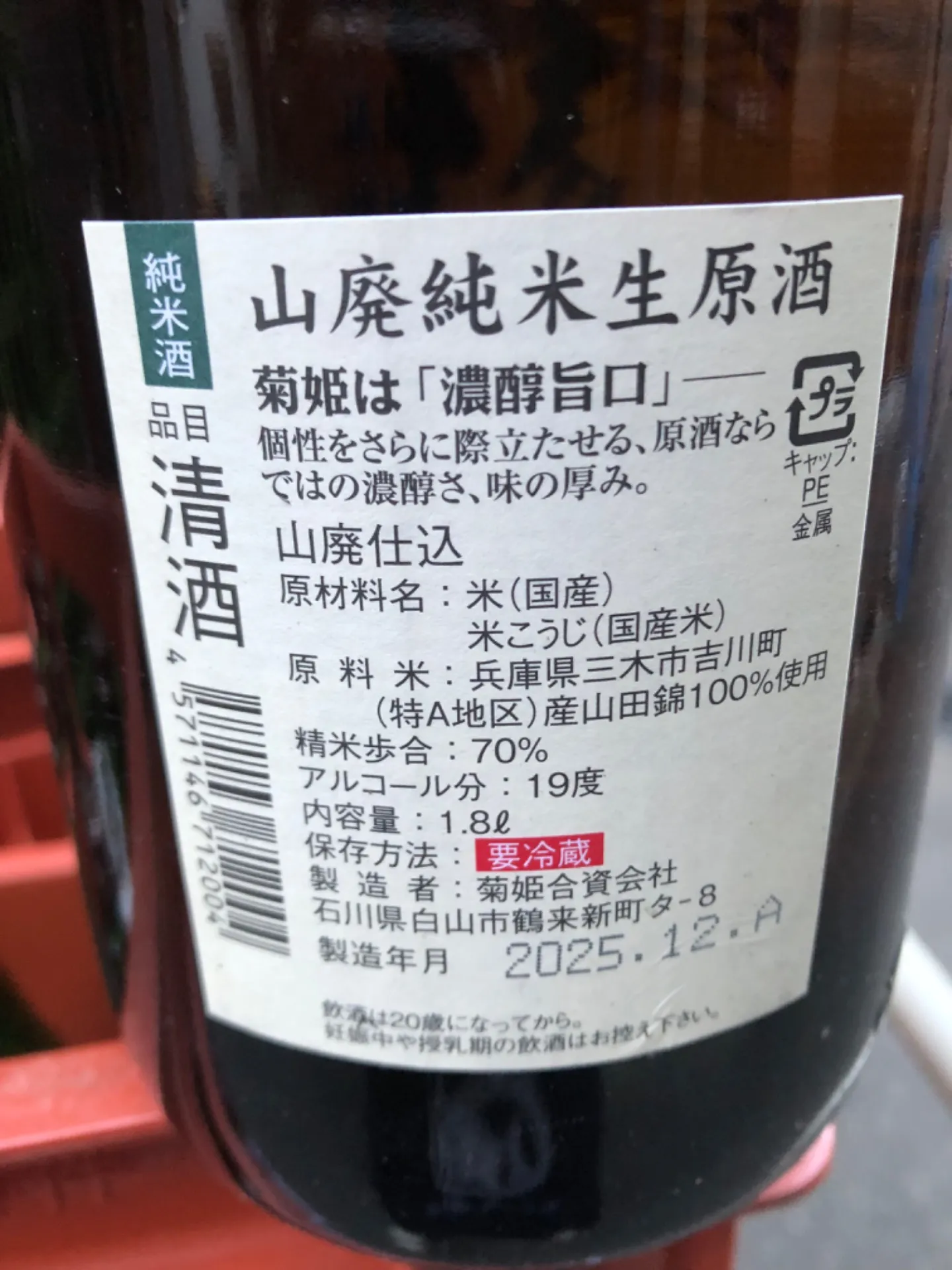 石川県 菊姫合資会社 菊姫 山廃仕込 無濾過 純米生原酒 1800ml