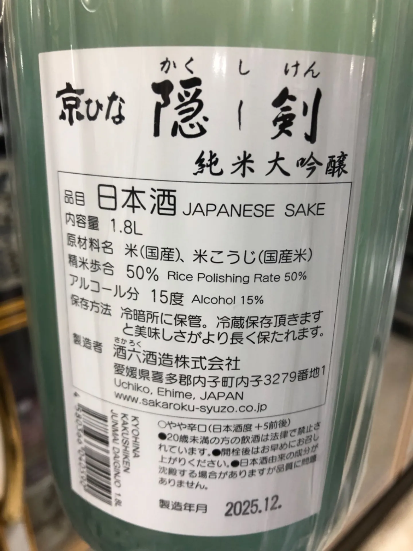愛媛県 酒六酒造 京ひな 隠し剣 純米大吟醸 1800ml