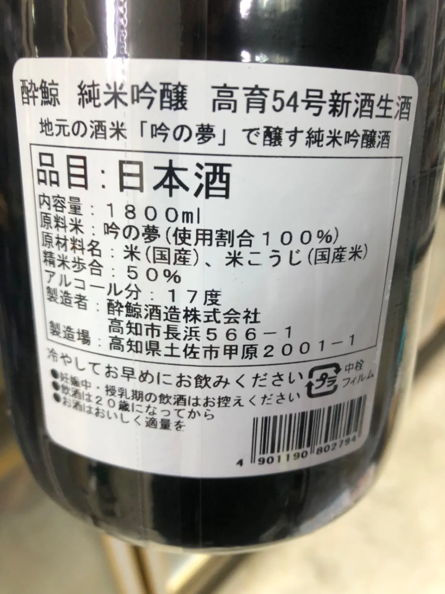 高知県 酔鯨酒造 酔鯨 純米吟醸 新酒生酒 高育54号 1800ml