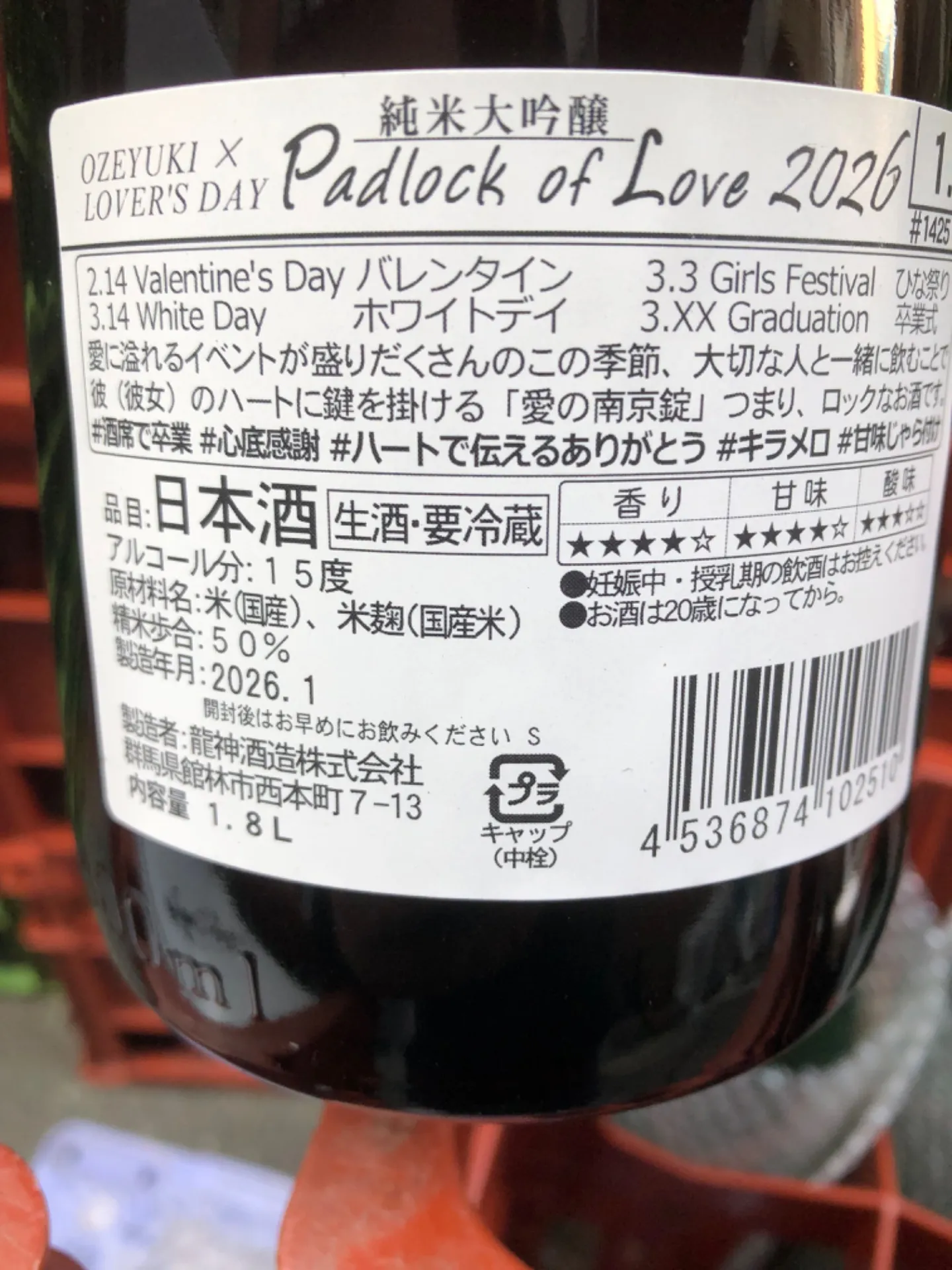 群馬県 龍神酒造 尾瀬の雪どけ Padlock of Love 純米大吟醸 1800ml