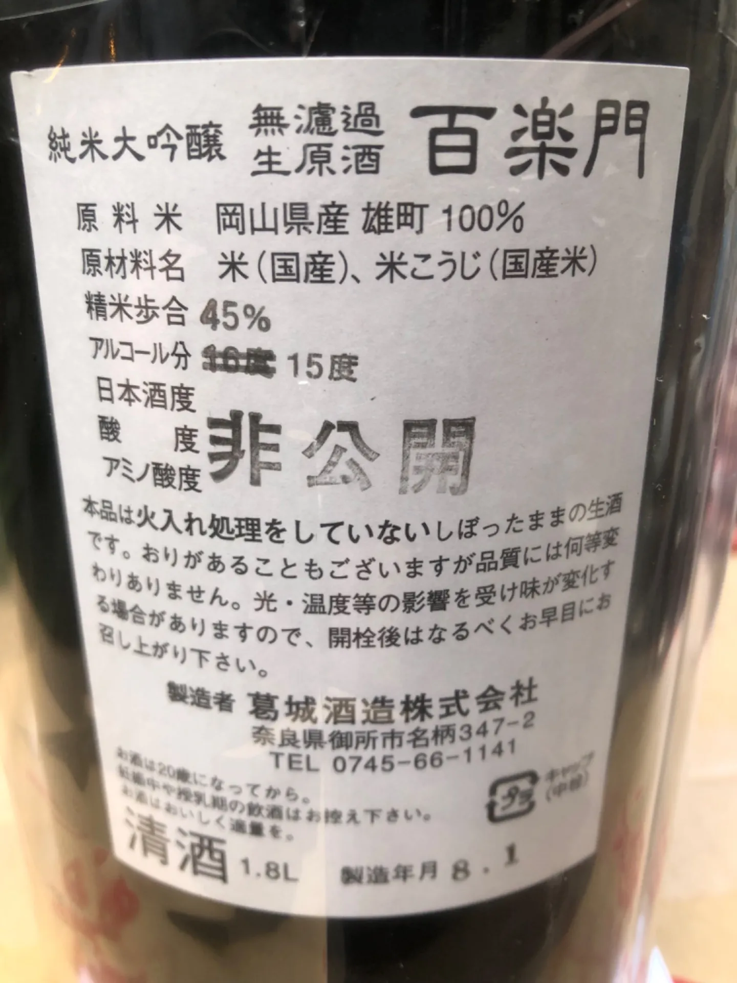 奈良県 葛城酒造 百楽門 純米大吟醸 無濾過生原酒 備前雄町100% 1800ml