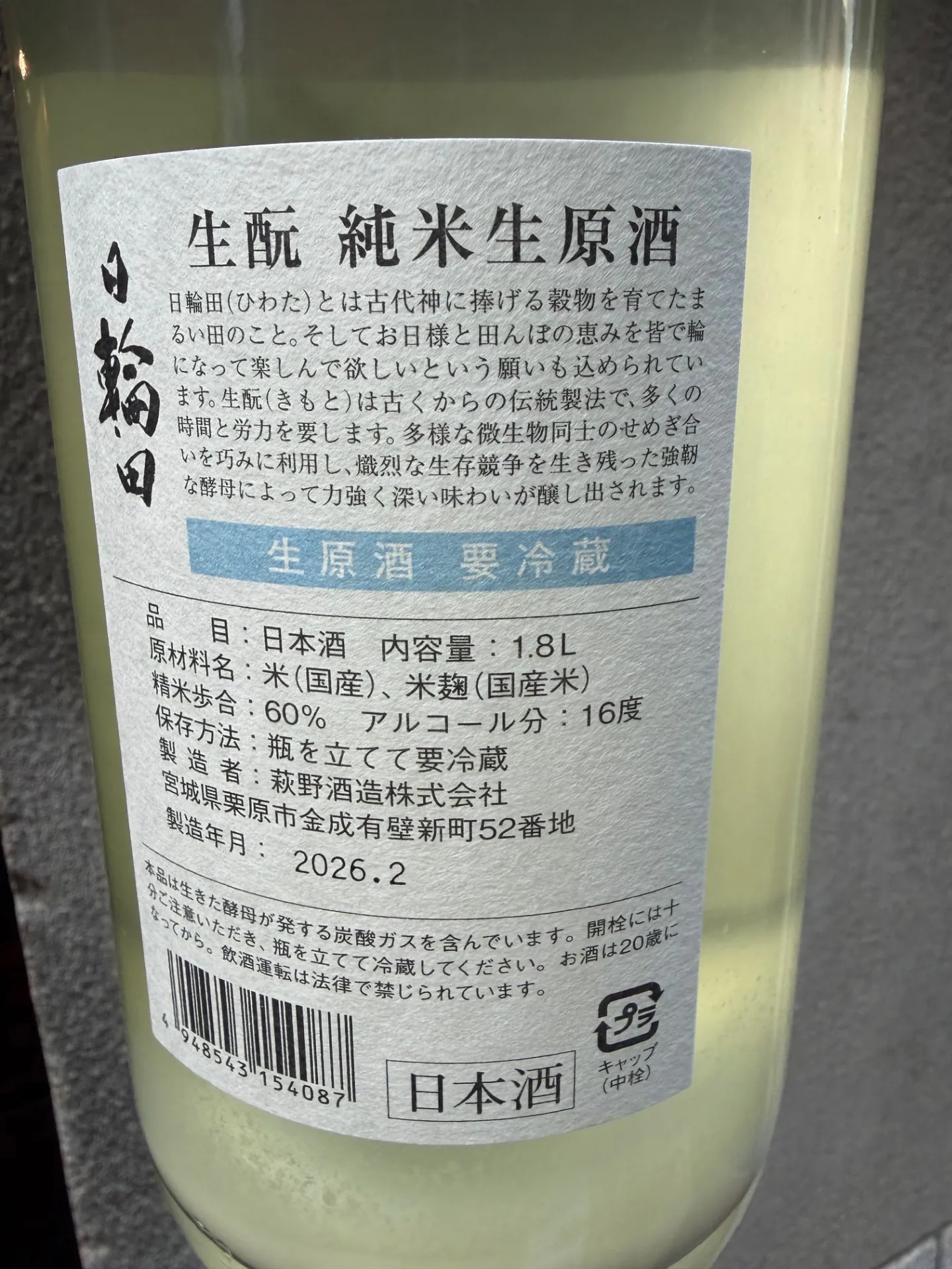 宮城県 萩野酒造 日輪田 生酛 純米生原酒 1800ml