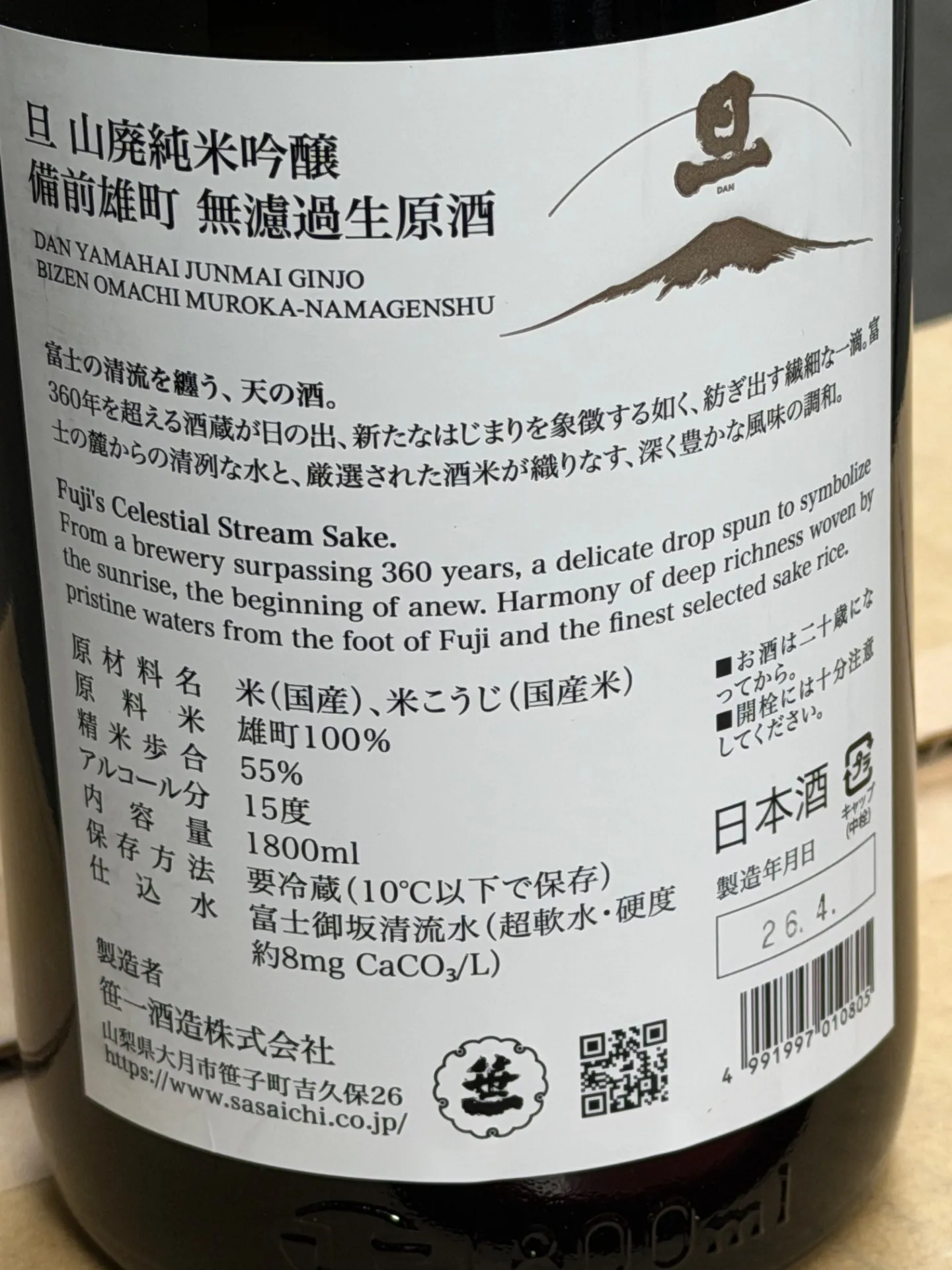 ️ 山梨県 笹一酒造 旦 山廃 純米吟醸 無濾過生原酒 備前雄町 1800ml