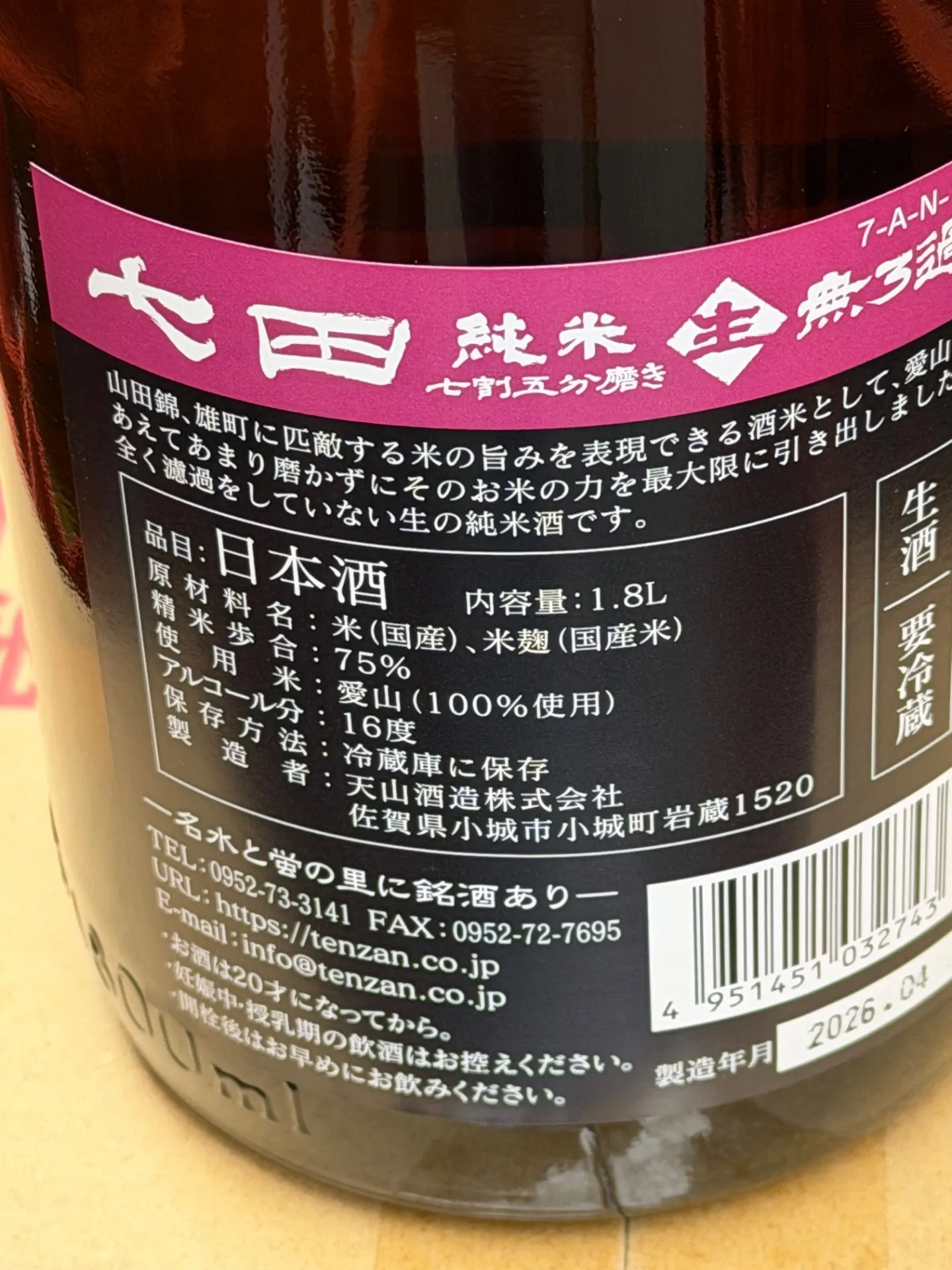 佐賀県 天山酒造 七田 純米 無濾過生 七割五分磨き 七田の心2026 全量愛山使用 1800ml