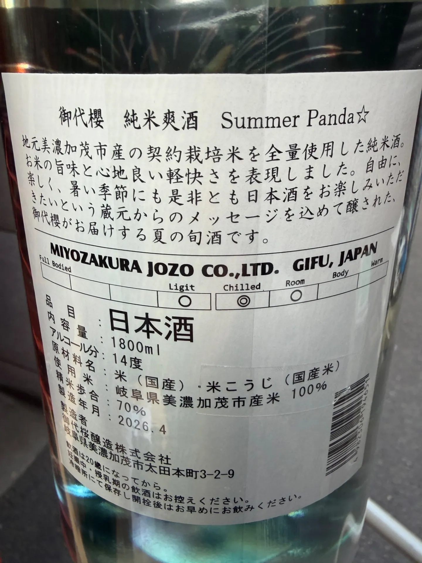 岐阜県 御代櫻酒造 御代櫻 Summer Panda☆ 純米爽酒 1800ml