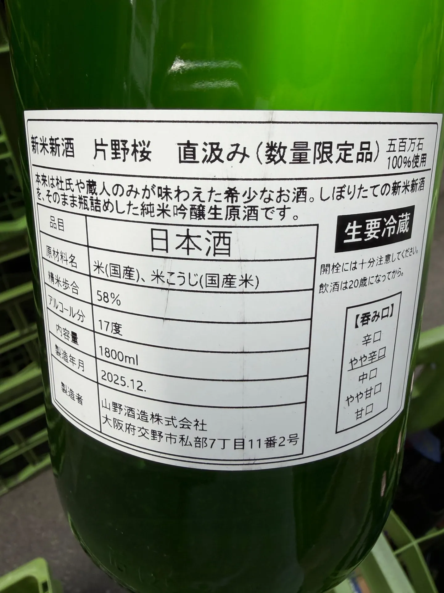 大阪府 山野酒造 片野桜 新米新酒 直汲み生 純米吟醸 五百万石 1800ml